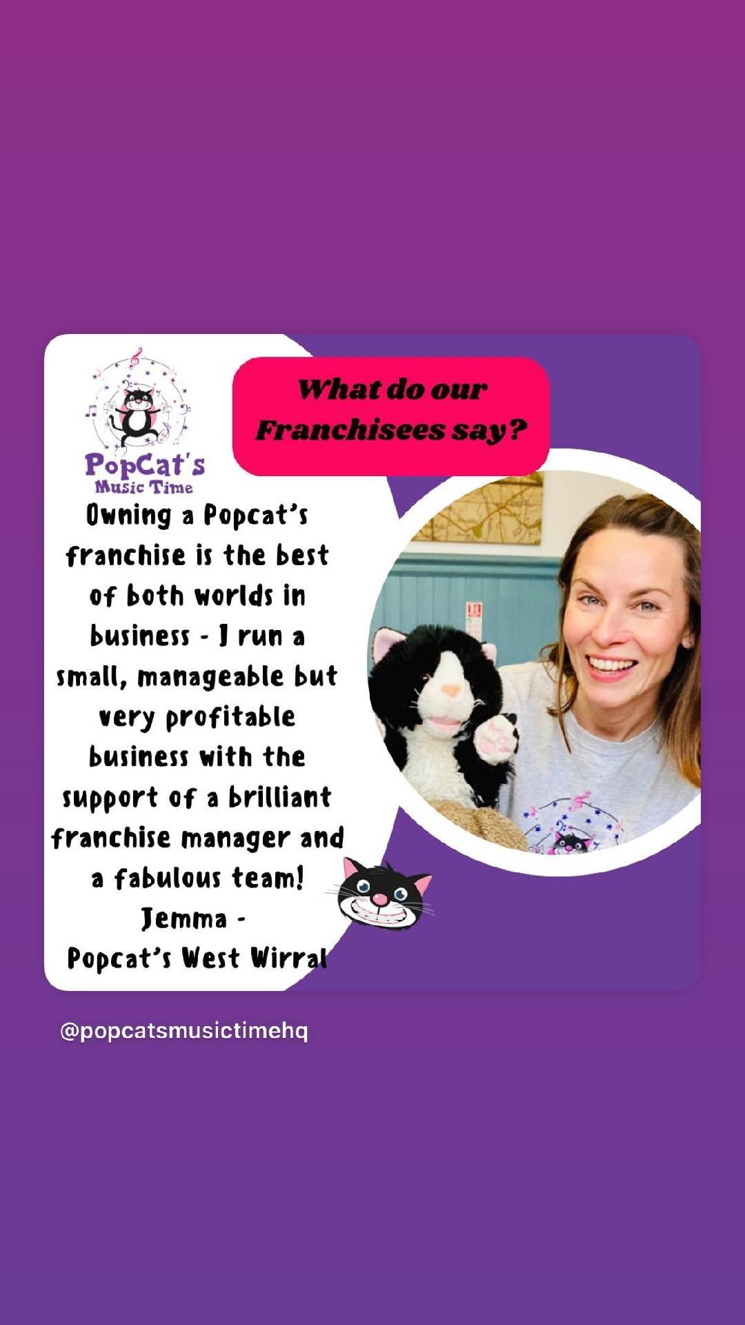Before beginning my sessions, I received in depth training which included everything that I needed from session structure and delivery to the ins and outs of business and social media marketing. The support doesn't stop there either; Catherine and Jess are always on hand to answer any questions and we have a termly team meeting too. I'm now feeling much more confident, just 2 months in. What I have really loved is the supportive network that is provided by other more experienced Popcat franchise owners. We're all in a group chat together and this provides a great source for advice and further support.